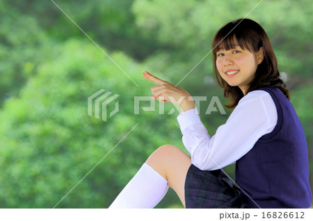 新緑と指差す学生