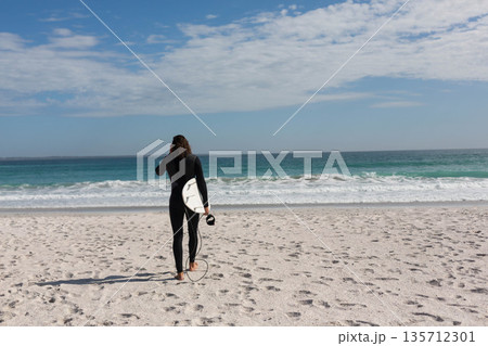 Female surfer in black wetsuit walking on beach carrying white surfboard and leash toward waves