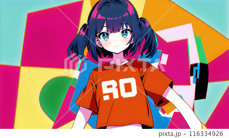 カラフルな幾何学模様を背景にオレンジ色のTシャツを着た黒髪の女の子