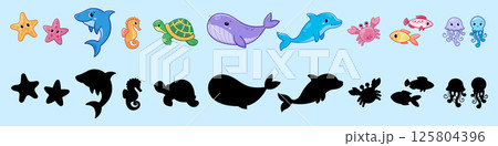 A set of illustrations and silhouettes of marine animals. Vector elements of marine inhabitants.