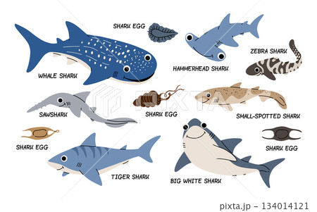 Vector color set of illustrations with different types of sharks on a white background. Flat illustration of sharks. Underwater world, ocean, underwater inhabitants.