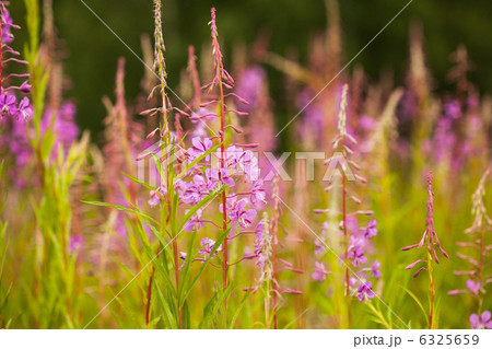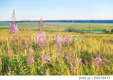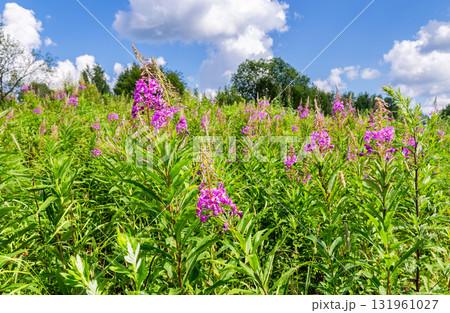 A field of blooming fireweed on a sunny summer day, selective focus.