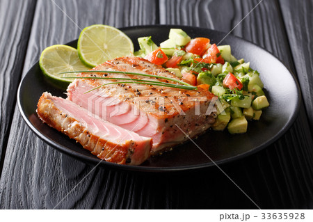 Grilled tuna steak with pepper and avocado salsa