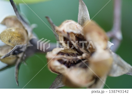 サルスベリの種が飛びだした後のカラ(たくさんの実の殻をつけた百日紅の枝先)