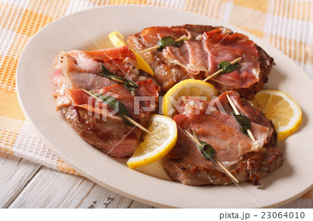 Delicious traditional italian saltimbocca alla romana with prosciutto and sage on a marble table