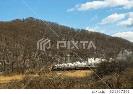 走行する蒸気機関車(北海道・サルボ展望台)