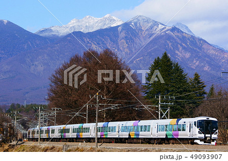 うっすら雪の積もった八ヶ岳とE257系・特急あずさ