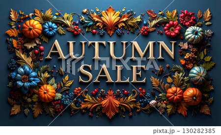 The word Autumn, made in 3D style filled with autumn leaves on green background