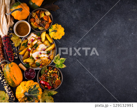 thanksgiving dinner with roasted turkey and candles. autumnal or christmas decoration. Top view. Copy space