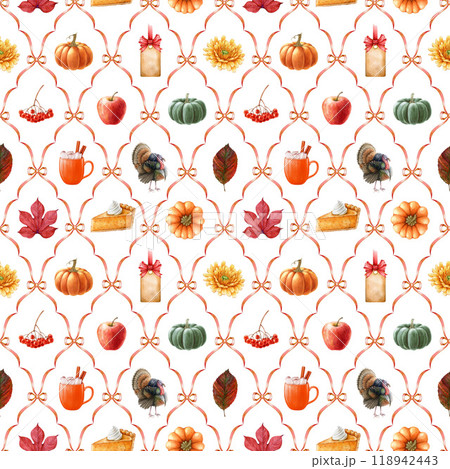 Thanksgiving decor traditional elements in warm colors seamless pattern. Vintage style illustration. Orange pumpkins, turkey bird, autumn harvest gifts. Elegant Thanksgiving seamless pattern design