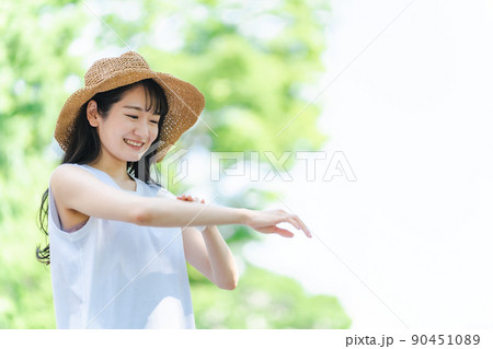 日焼け止めを塗る女性。日焼け予防。日焼け防止。サンクリーム。夏のスキンケア。ベクターイラスト