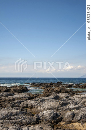 青い海と緑の森が美しい神引展望台から見る、式根島と新島の海。 中の浦海水浴場、神引浦。 東京都伊豆