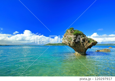 【沖縄県】快晴の浜比嘉島の岩屋の小島アマンジのハートロックと宮城島