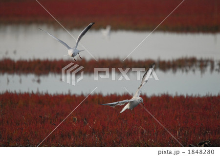サロマ湖キムネアップ崎の紅葉する珊瑚草群落地とサギの集団