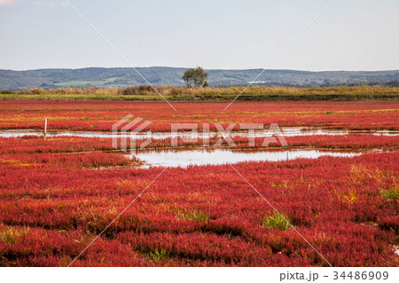 一面赤色に染まる卯原内サンゴ草群落地 北海道網走市 能取湖