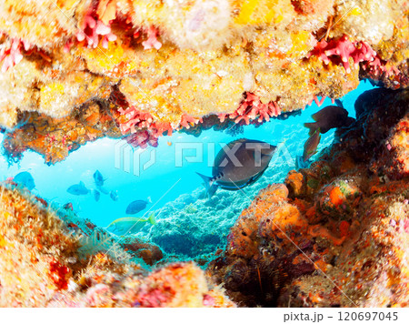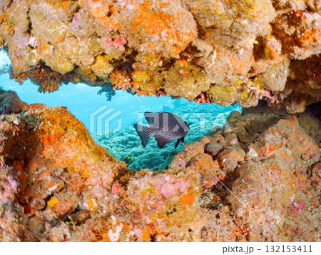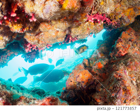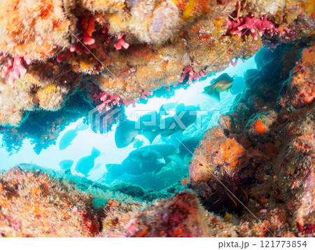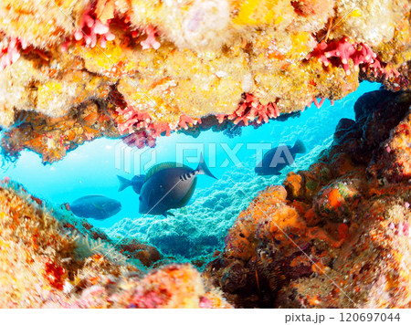 水中洞窟の美しいアオブダイ、ニザダイ、メジナ、ハコフグ他群れ 伊豆半島賀茂郡南伊豆町中木ヒリゾ浜