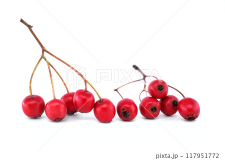 Closeup of fresh red common hawthorn berries isolated on a white background, Crataegus monogyna