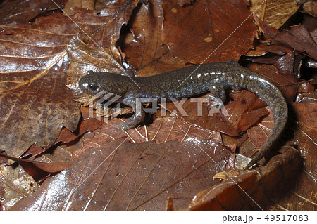 沢の近くを歩くヒガシヒダサンショウウオ雌