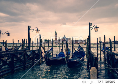夕日を浴びるゴンドラとサン ジョルジョ マッジョーレ島