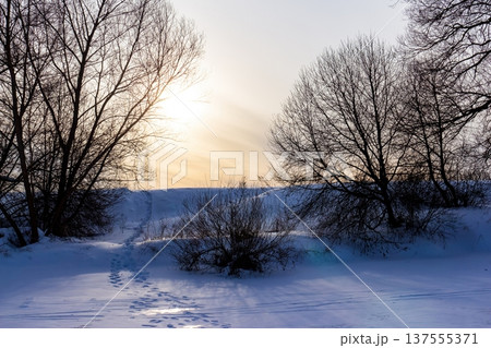 Winter's quiet embrace on a serene snowy river, framed by bare trees at golden hour. Footprints mark a peaceful path across the frozen landscape, highlighting nature's tranquil beauty