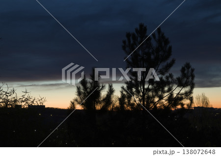 Panoramic view of the bright orange sunset sun among dark clouds, Tokyo, Japan