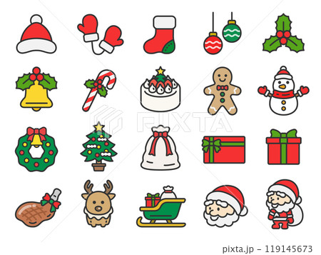 いろいろな、クリスマスのアイコン(線画カラー)のイラストセット