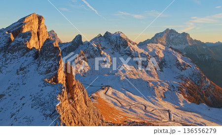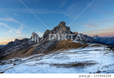 Panorama of Passo Giau in the Dolomites mountains during autumn sunrise. Beautiful mountains of Alpi Dolomiti in Italy, South Tirol