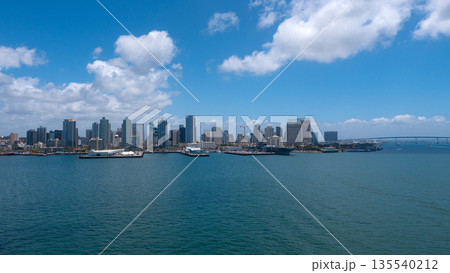 San Diego, California, USA - May 17, 2019: Aerial cityscape of bay with building and ocean. Skyline and cityscape. San Diego skyline Bay. Harbor At California In San Diego United States. Coast city