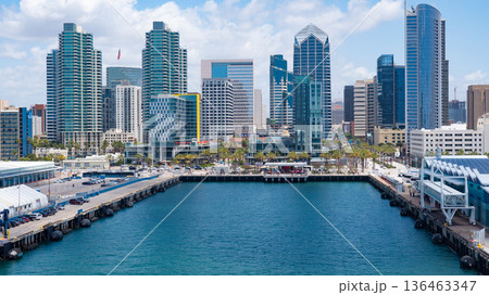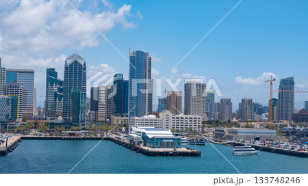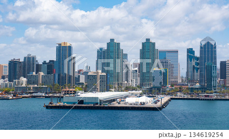 San Diego, California, USA - May 17, 2019: San Diego Bay with skyscraper. Harbor At California In San Diego. Coast city. Aerial cityscape of bay with building and ocean. Skyline and cityscape
