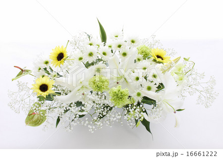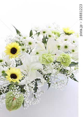 百合とひまわりとスプレーマム他のアレンジ(横 全体 正面)