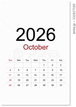 Calendar October 2026 flat style isolated on white background, Save clipping path.