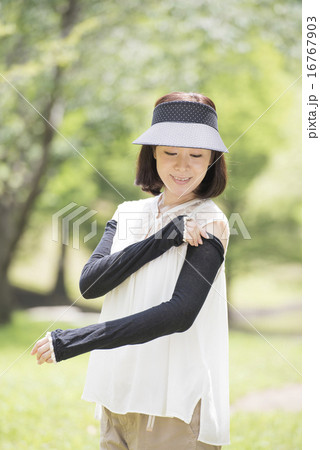 サンバイザーとアームカバーで日焼け対策万全の女性