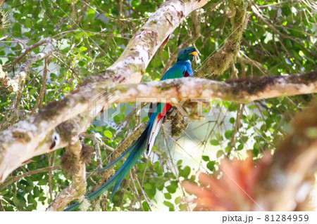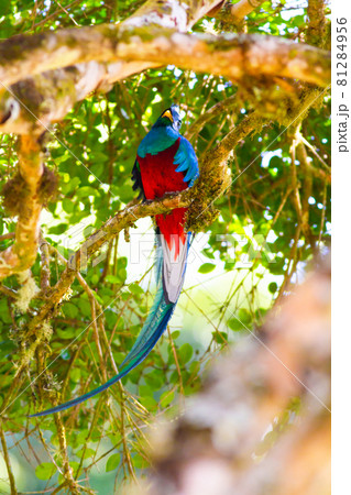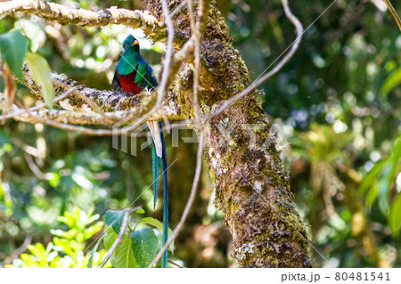 森の枝に止まってあたりをうかがう色鮮やかなケツァール