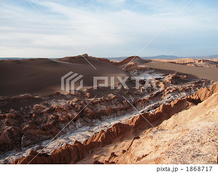 南米チリ共和国北部、サンペドロ近郊の月の谷に点在する塩で白くなった岩山と、その遥か彼方には夏でも雪を戴くアンデスの山並みが観える。
