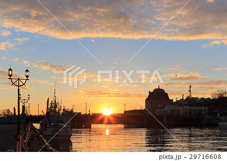 朝焼けの漁港を出る漁船 / 北海道の漁港 新鮮な魚介類のイメージ