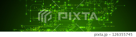 Digital circuit visualization vector background. Green board pattern with interconnected lines, nodes, and binary code.