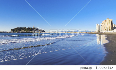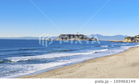 湘南江ノ島を望む鎌倉市の腰越海岸の春