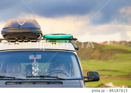 Blue minivan car with surfboard and luggage on roof rack. Surfer's vehicle. Isolated image on white