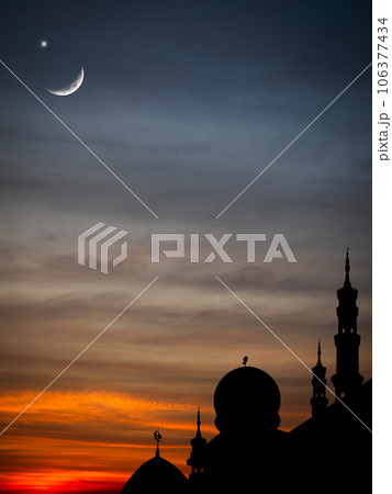 Mosque Dome ramadan Grand Uae with Crescent Moon Star Abstract Sunset Background, Sky Arab Emirates Sheikh Islamic Architecture Islam Masjid Minaret Building Mubarak Silhouette Eid Zayed Kareem Abu.