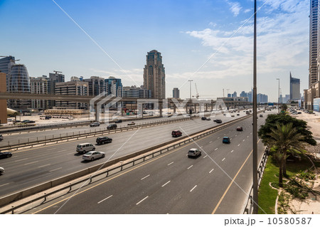 Modern skyscrapers and busy evening highways day to night timelapse in luxury Dubai city, Dubai, United Arab Emirates