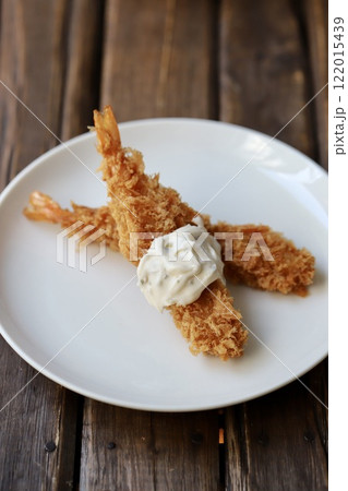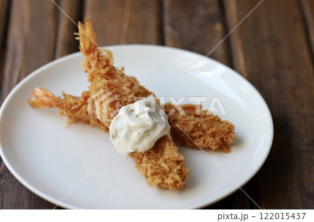 タルタルソースをかけたザクザク衣の真っ直ぐエビフライ