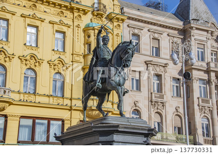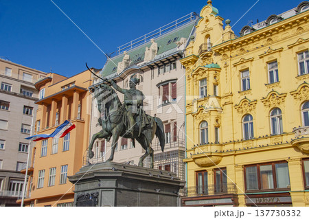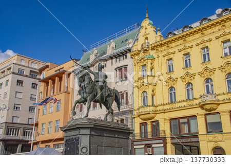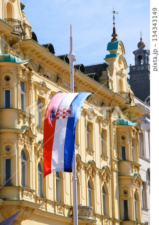 クロアチア、ザグレブ旧市街の中心地イェラチッチ広場ではためくクロアチア国旗とその周辺の景色