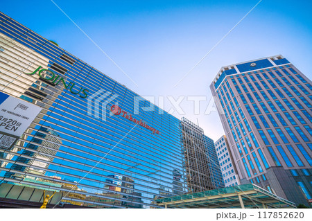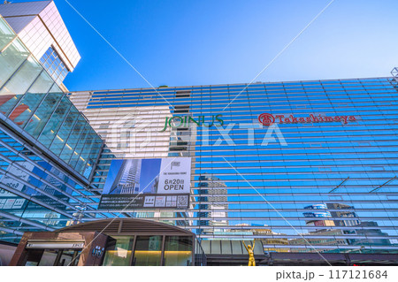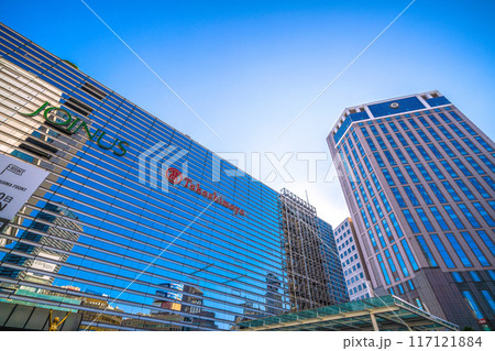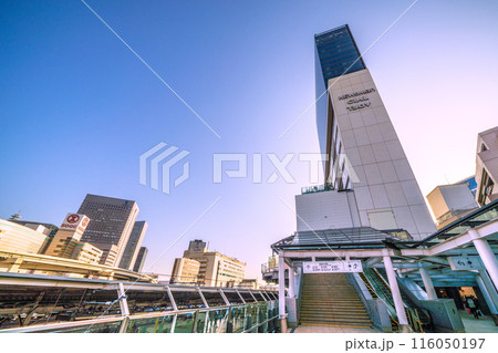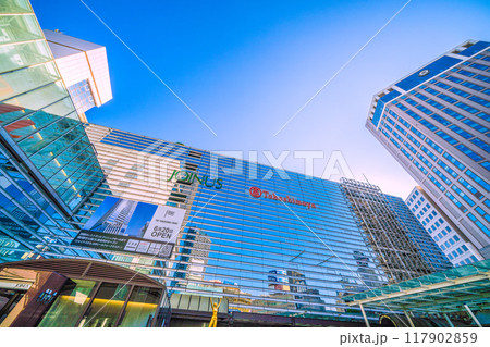 日本の横浜都市景観 歩行者デッキ「はまレールウォーク」から横浜駅やJR横浜タワーなどを望む