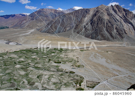 インド・ラダック地方 インダス川流域の山々とオアシスの谷を望む道路 / Ladakh, India
