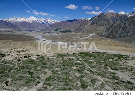 ジャンムー・カシミール州ラダック地方ラマユルから眺めるインダス川流域とザンスカール山脈の眺望
