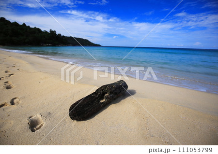 夏空とカタノイビーチに流れ着いた流木(タイ プーケット)
