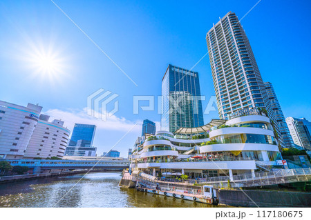日本の横浜都市景観 希望の光…横浜ベイクォーターや水上バス(到着)などを望む。タワマンに反射する太陽