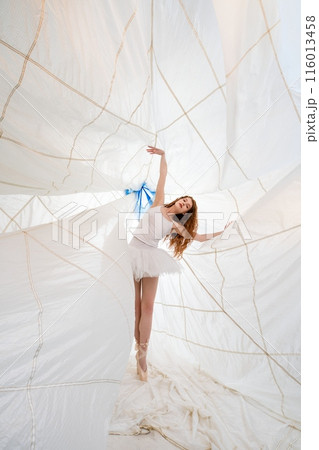 Ballet dancer in motion wrapped in fabric performing upward stretch