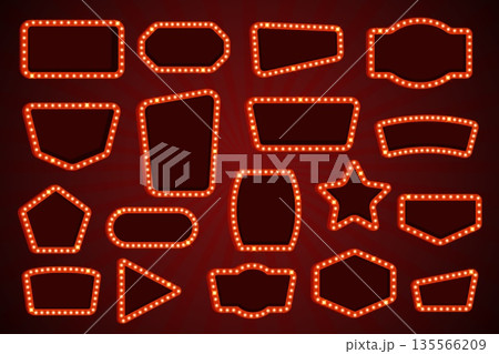 Retro cinema signboards. Vintage light box signages bulbs, movie theater vegas casino hollywood circus show theatre billboard night signboard frame shapes kicky vector illustration