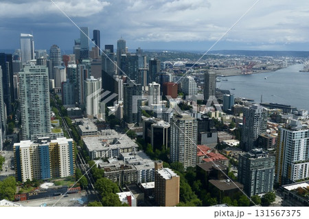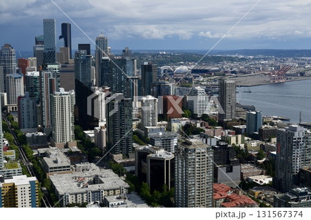 Aerial view of downtown in Seattle from Space Needle on rainy day